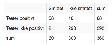 Det viser seg at 68 av personene tester positivt (det vil si at testen viser at de er smittet av sykdommen). Av disse 68 er det 10 personer som forskerne vet ikke er smittet.