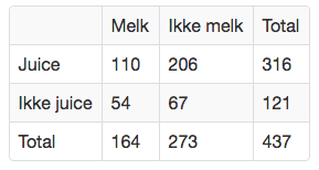 Ved en skole er det 437 elever. 164 av elevene drikker melk hver dag. 316 av elevene drikker juice hver dag. 67 av elevene drikker verken melk eller juice hver dag.