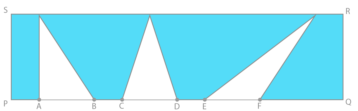 Figuren ovenfor viser et rektangel PQRS. PQ=12cm, QR = 3cm og AB = CD = EF = 2cm