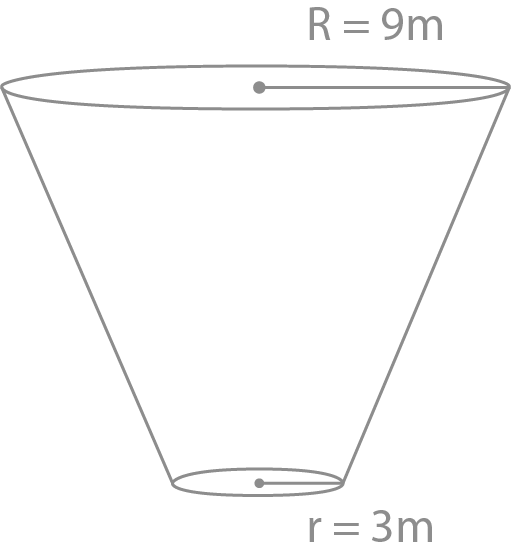 Figuren til høyre viser en tank formet som en rettavkortet kjegle. Radius i bunnen er r = 3 m, og radius i toppen er R = 9 m.
