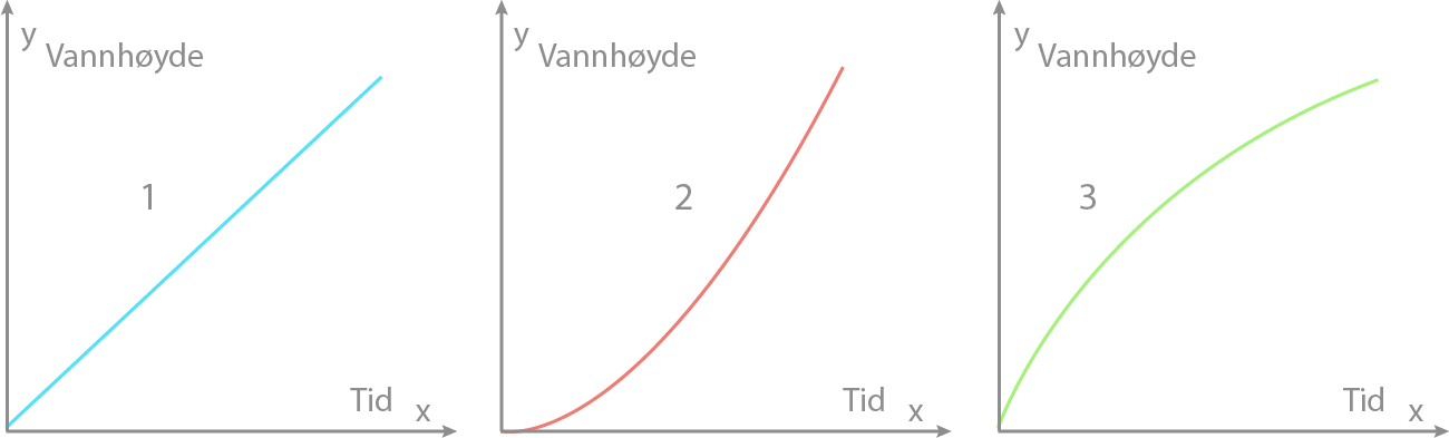 c) Hvilken av de tre grafene nedenfor illustrerer best hvordan vannhøyden i tanken endres med tiden? Begrunn svaret ditt.