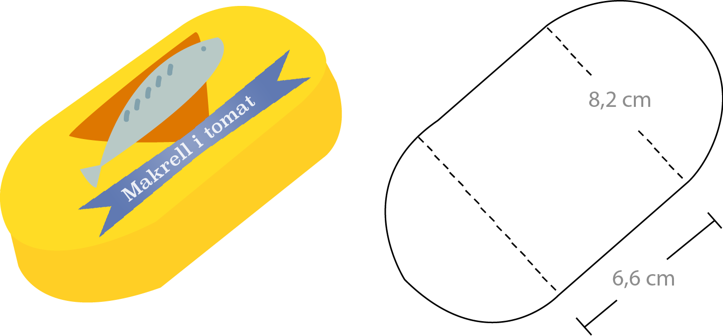Ovenfor ser du en boks «Stabbur-Makrell». Bunnen av boksen er tilnærmet lik et rektangel og to halvsirkler og har form som vist på figuren til høyre. Rektangelet har lengde 8,2 cm og bredde 6,6 cm.