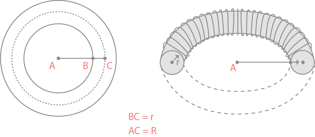 der BC = r radius i aluminiumsrøret og AC = R er avstanden fra sentrum i det sirkelformede hullet i midten av torusen til sentrum i aluminiumsrøret.