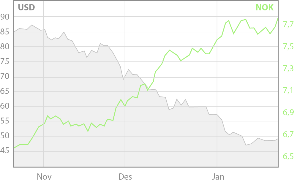 Den grå grafen i diagrammet ovenfor viser hvordan prisen for et fat olje, gitt i dollar (USD), utviklet seg fra slutten av oktober 2014 til slutten av januar 2015. Den grønne grafen viser hvordan dollarkursen utviklet seg i den samme perioden.