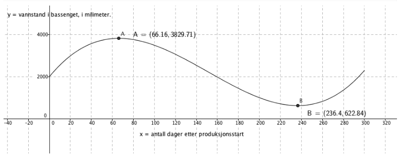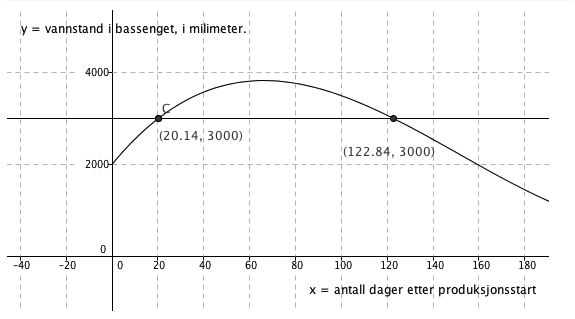 c) Bruk graftegner til å løse likningen f(x) = 3000 Hva forteller løsningene om vannstanden i bassenget?