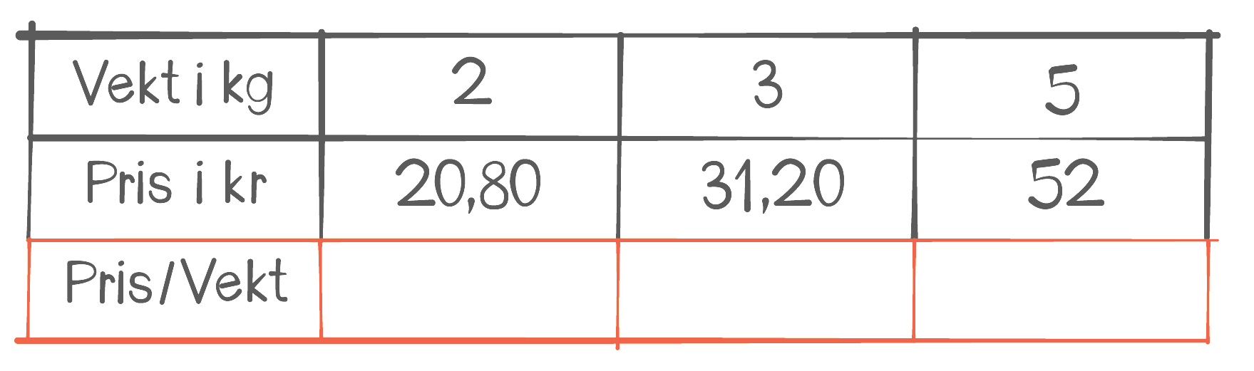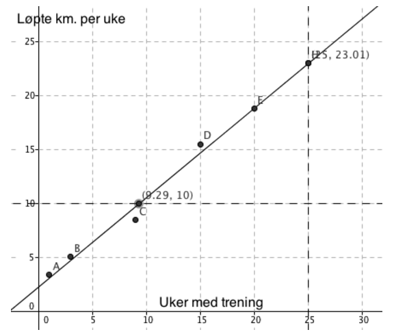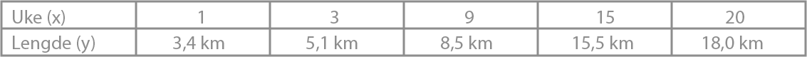 Tabellen ovenfor viser hvor langt Janne jogget noen uker etter at hun begynte å trene. Den