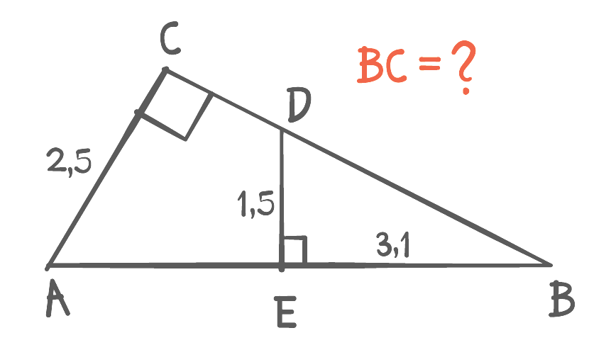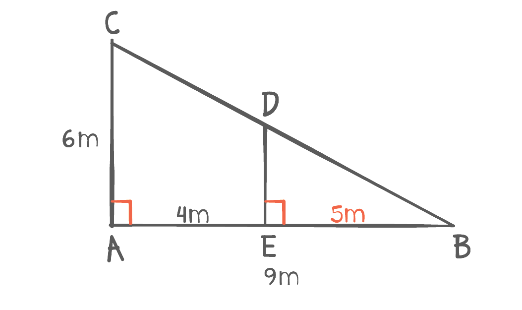 Trekantene ABC og ADE er formlike. De har en felles vinkel, to felles sider og linjestykkene DE og BC er parallelle.