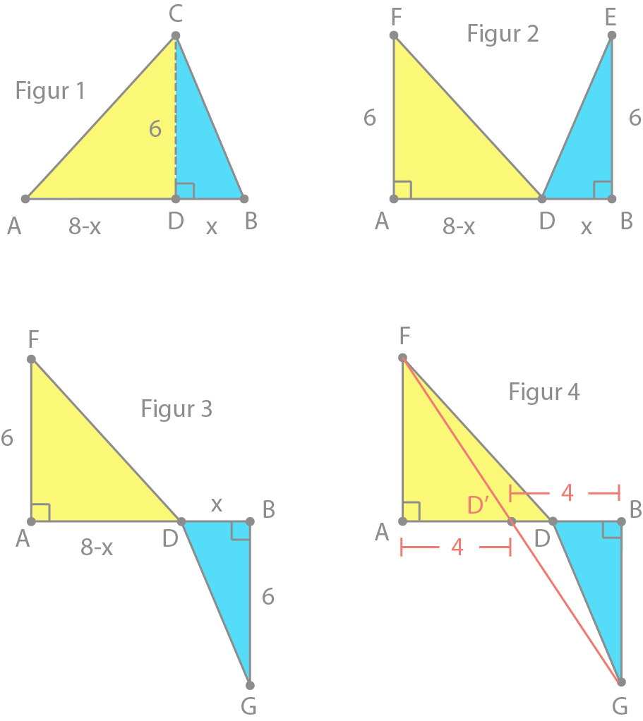Han "flipper" først trekantene ADC og DBC på linjestykket AB. Så speilvender han trekanten DBE om linjestykket AB. Punktene F og G har samme avstand (6) fra linjestykket AB. I planet er den korteste vei mellom to punkter en rett linje. Han trekker denne. Den skjærer linjestykket AB i D´. I D´ har vi toppvinkler. I tillegg er vinkel A og B begge 90 grader. Vinklene i trekantene AD´F og GBD´er derfor like. Det er også sidene AF og GB. Av det kan man slutte at disse to trekantene er kongruente, og Petter har rett.