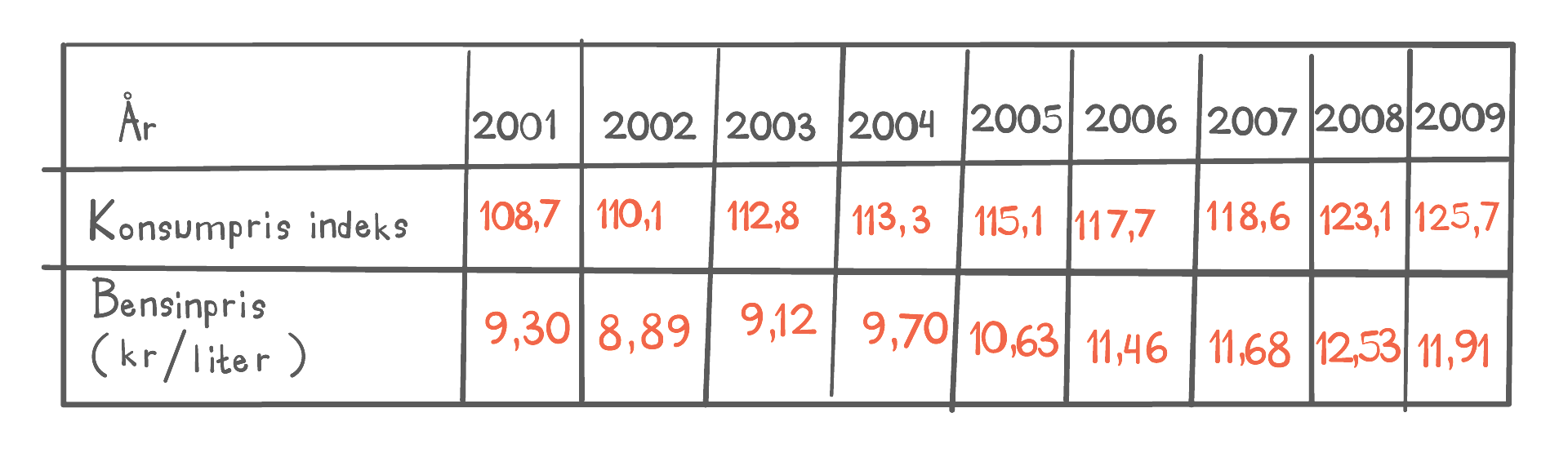 En eksamensoppgave om konsumprisindekser og bensinpriser og prosent, fra høsten 2010.