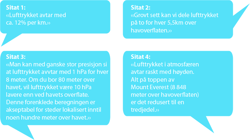 I denne oppgaven skal vi bruke sitater fra ulike nettsider og se på noen modeller for hvor stort luftrykket er x kilometer over havets overflate.