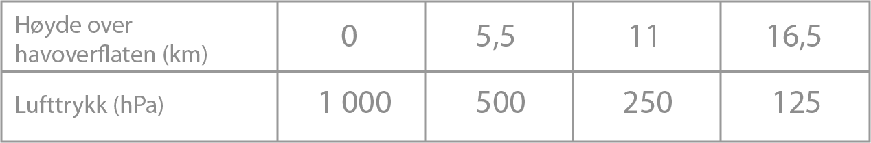 Ved havets overflate er lufttrykket ca. 1 000 hPa (hektopascal).