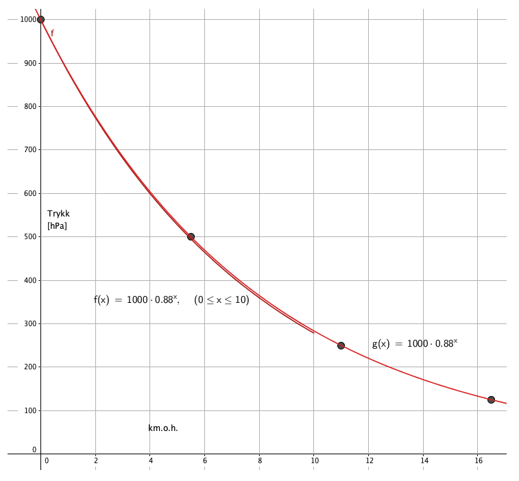 d) Bruk hver av de tre modellen f, g og h til å bestemme lufttrykket 8 848 meter over havoverflaten. Sammenlikn svarene du får, med sitat 4, og kommenter.