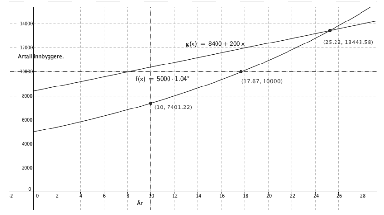 • c) Hvor mange innbyggere vil det være i Alvfjord om 10 år ifølge modellen i oppgave a)? Når vil innbyggertallet i Alvfjord passere 10 000 ifølge modellen i oppgave a)?