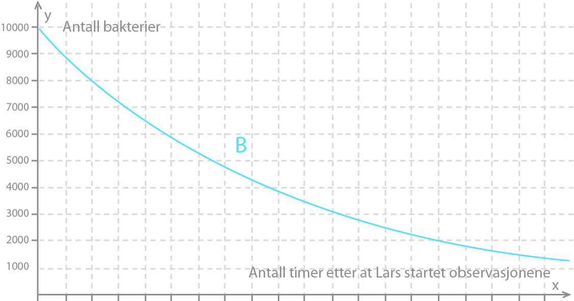 Lars observerer en bakteriekultur. Fra han startet observasjonene, har antall bakterier avtatt eksponentielt. Se grafen til funksjonen B ovenfor.