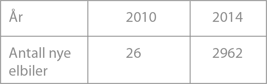 Tabellen nedenfor viser hvor mange nye elbiler som ble solgt i Hordaland i 2010 og 2014.