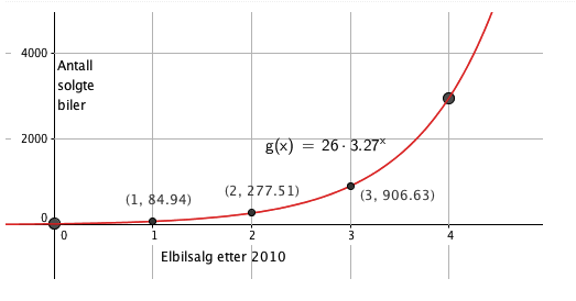 a) La x være antall år etter 2010. Bruk opplysningene i tabellen til å bestemme en eksponentiell modell f(x) for elbilsalget i Hordaland.