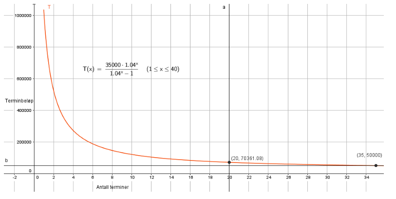 Dersom du betaler tilbake lånet i løpet av xx terminer, er terminbeløpet T(x)T(x) kroner gitt ved