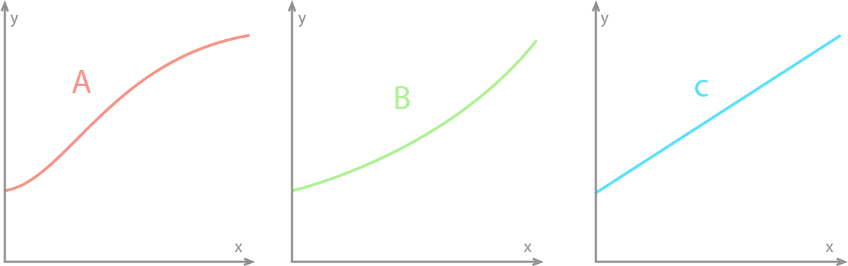 b) Nedenfor ser du tre ulike grafer. Hvilken eller hvilke av disse grafene illustrerer eksponentiell vekst? Begrunn svaret ditt.