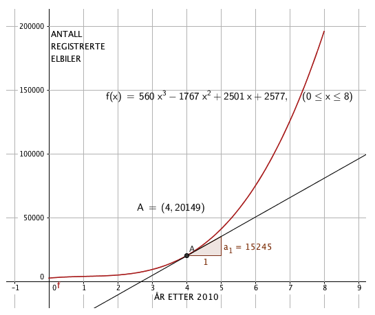 f(4)=20149 , Fra figuren i a. Det betyr at i 2014 var det ca 20150 registrerte elbiler. f(ˊ4)=15245 betyr at økningen i registrerte elbiler i 2014 var ca. 15245.