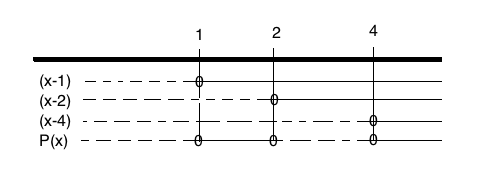 Abc formel eller lignende gir følgende førstegradsfaktorer: P(x)=(x−1)(x−2)(x−4)