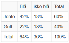 Fra tabellen ser man at sannsynligheten for å trekke en elev med blå øyner er 64%.