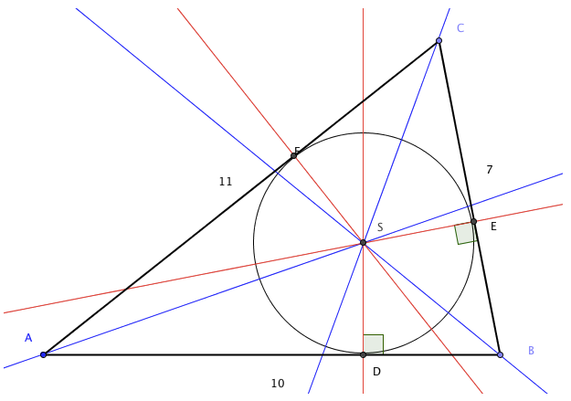 d) Forklar at SD = SE = SF. Konstruer den innskrevne sirkelen i ΔABC