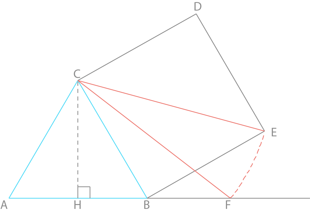 I en rettvinklet trekant ABC er ∠ABC=90∘. La H være midtpunktet på AB. La videre CBFG og ACDE være kvadratene. Punktet I er skjæringspunktet mellom forlengelsen av linjestykket HC og linjestykket DG.
