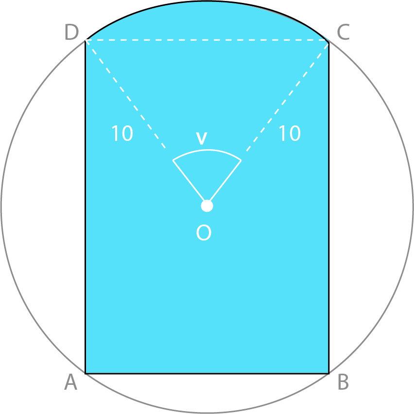 Et rektangel ABCD er innskrevet i en sirkel. Sirkelen har sentrum i O og radius r=10.