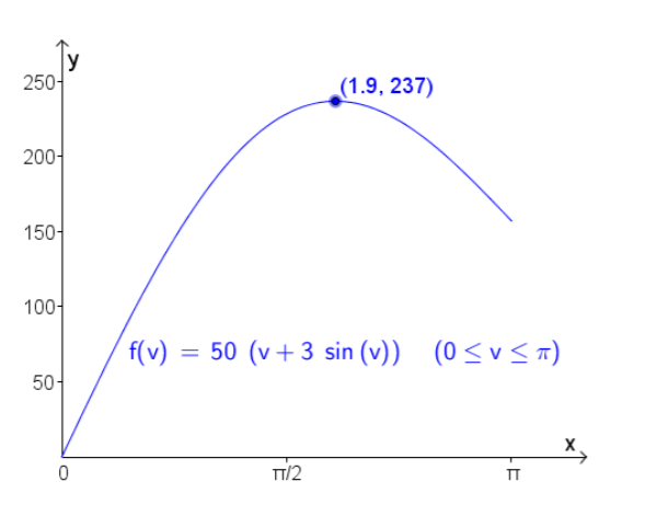Vi bruker kommandoen T(v)=Funksjon[50(v+3sin(v)),0,π] for å tegne funksjonen