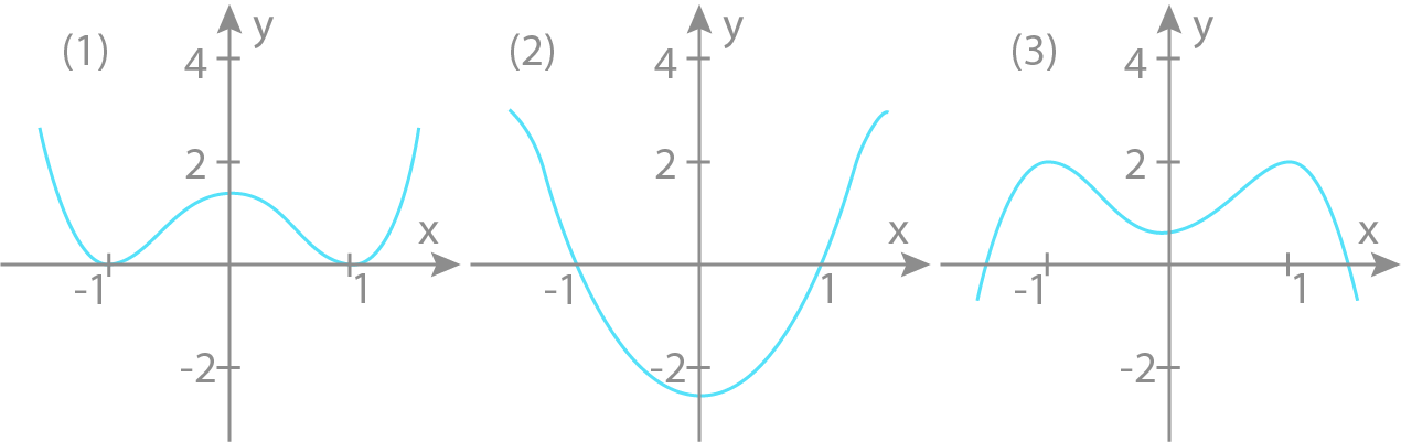Graf (1) har bunnpunkter for x=±1 og toppunkt for x=0. Dette stemmer med det vi fant tidligere i denne oppgaven. Graf (2) har riktignok nullpunkter for x=±1, men ikke bunnpunkt for disse verdien av x. Graf (3) har toppunkt for x=±1 og bunnpunkt for x=0, men x=±1 er ikke nullpunkter i dette tilfellet.