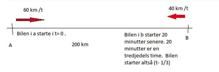 • . En annen bil starter i B 20 min senere og kjører mot A med farten 40 km h.