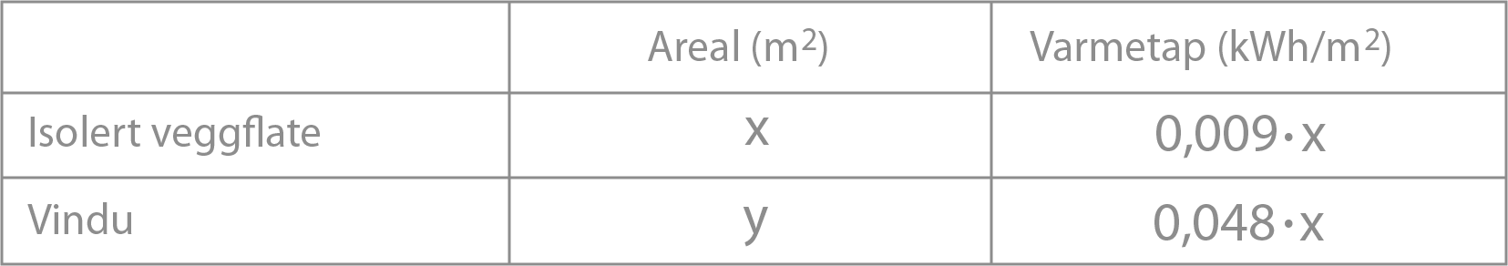veggflate og vindu. Tabellen nedenfor viser varmetapet per time gjennom isolert veggflate og