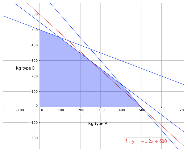 En uke har butikken tilgang til 300 kg torsk og 200 kg sei. De vet fra tidligere erfaringer at de ikke får solgt mer enn 550 kg fiskekaker. La x være antall kilogram de produserer av type A, og y antall kilogram de produserer av type B.