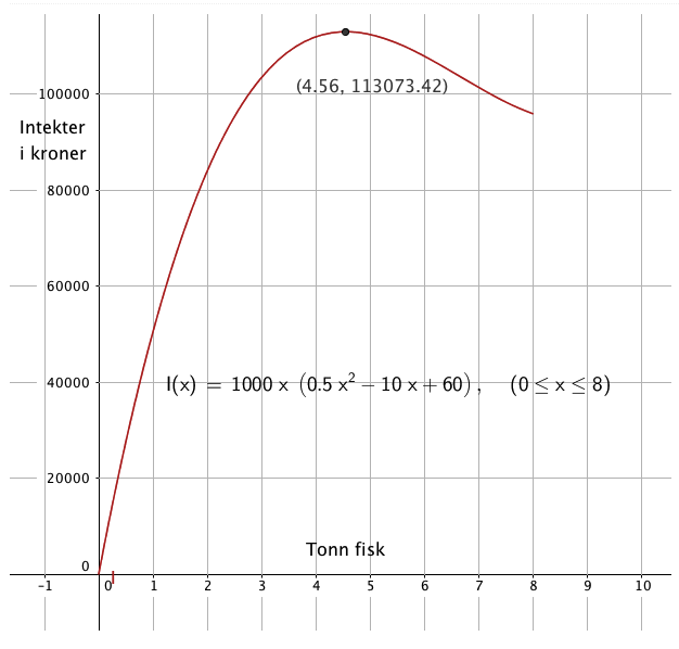 b) Bruk graftegner til å bestemme hvilken fiskemengde som gir størst inntekt. Hvor stor er inntekten da?