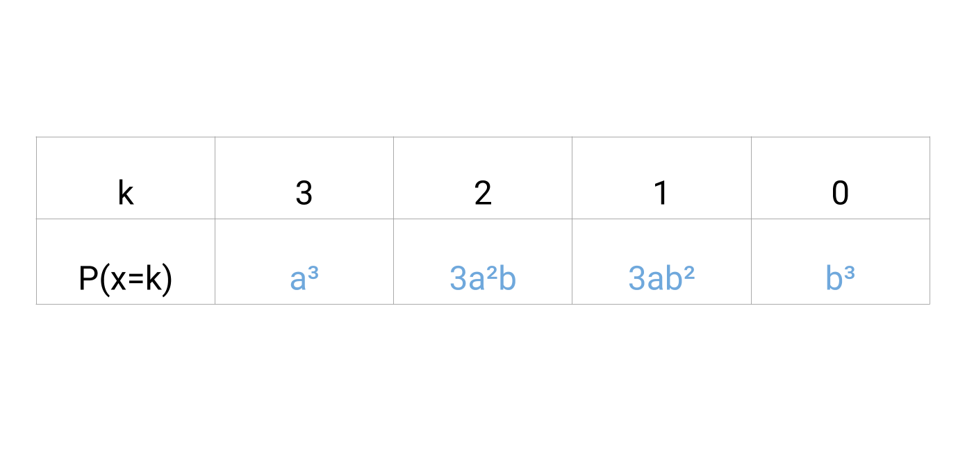 (a+b)3=1a3+3a2b+3ab2+1b3(a+b)^{3} = 1 \cdot a^{3} + 3 \cdot a^{2}b + 3 \cdot ab^{2} + 1 \cdot b^{3}