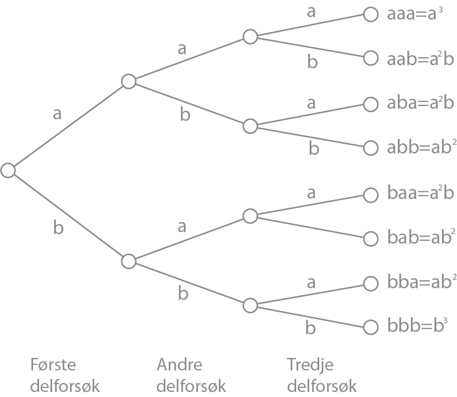 inntreffer eller ikke. Sannsynlighetene er P(A)=aogP(A)=bP(A) = a og P(\overline{A}) = b . Forsøket kan illustreres i et
