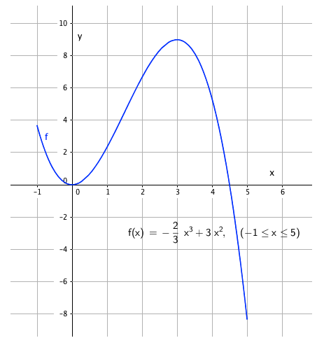 f(x)=23x3+3x2,1<x<5f(x)=-\frac{2}{3}x^{3}+3x^{2} , -1 < x < 5
