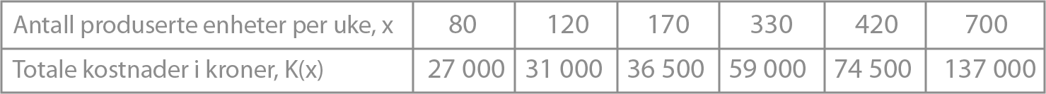 En bedrift produserer en bestemt vare. Tabellen nedenfor viser sammenhengen mellom antall produserte enheter av varen per uke og de totale kostnadene.