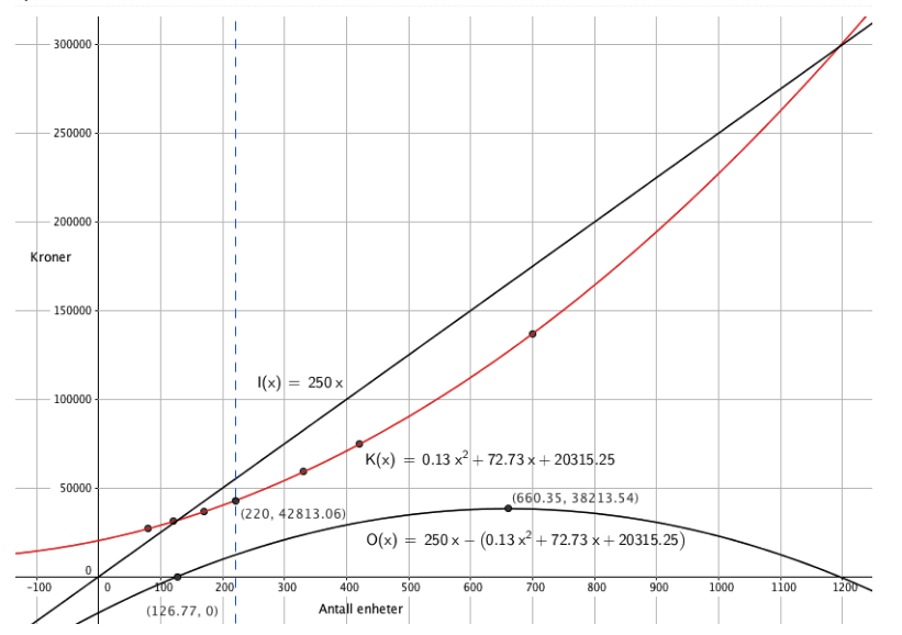a) Bestem en andregradsfunksjon K som med god tilnærming kan brukes til å beregne kostnadene K(x). Hva blir kostnadene i en uke der det produseres 220 enheter?