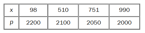 En bedrift produserer og selger en vare. Ved en markedsanalyse har de funnet ut at når prisen er p kroner per enhet, får de solgt x enheter av varen slik tabellen viser.