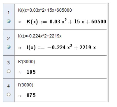 K(x)=0,03x2+15x+605,000K(x) = 0,03x^{2} + 15x + 605,000