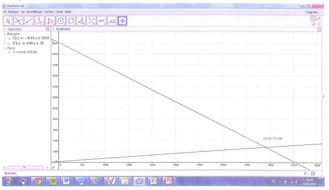 • c) Løs ulikheten I(ˊx)>K(ˊx)I\'(x) > K\'(x). Hva forteller svaret oss?